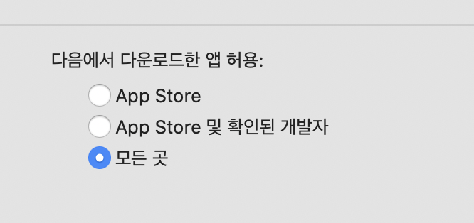 "모든 곳"으로 설정했을 경우, 이후 확인되지 않은 개발자가 만든 앱도 에러 메시지 없이 바로 실행하게 하게 된다.
