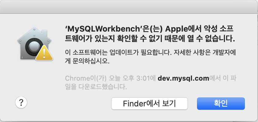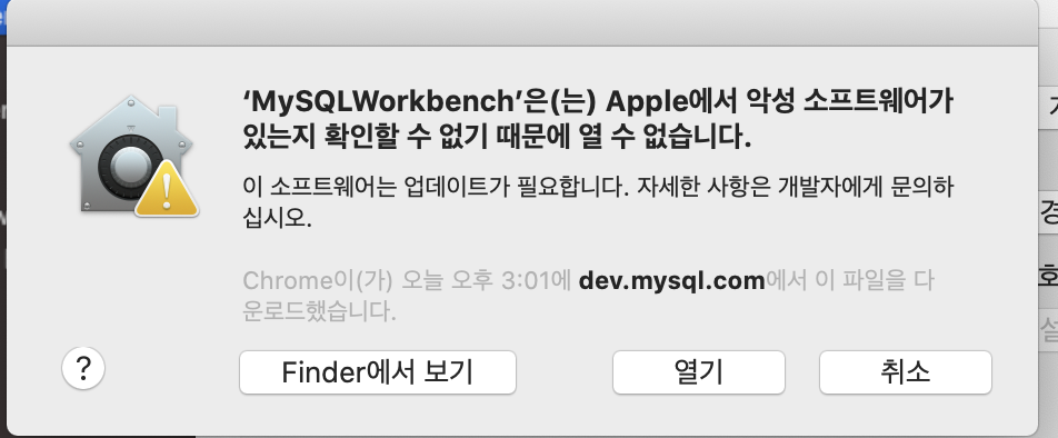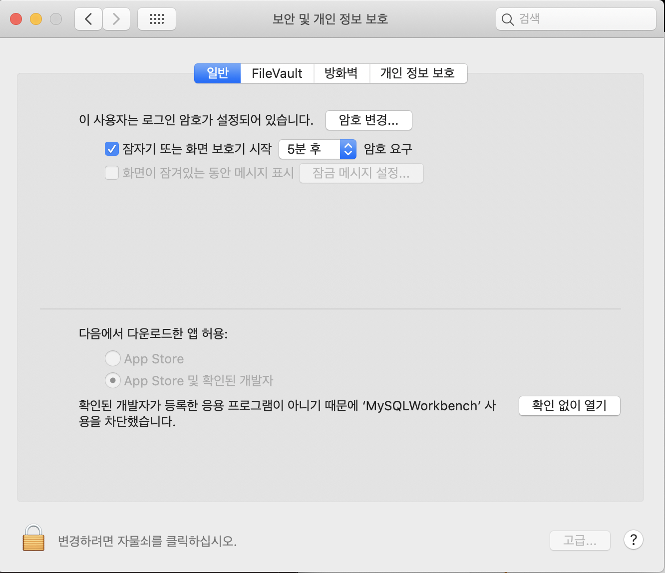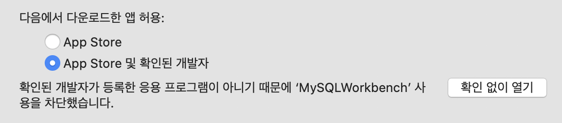 방금 "MySQL Workbrench" 실행했다가 [확인 되지 않은 개발자] 문제로 에러가 떴기 때문에 하단에 "확인된 개발자가 등록한 응용 프로그램이 아니기 때문에 'MySQL Workbrench' 사용을 차단했습니다." 라는 문구가 생겼다.
