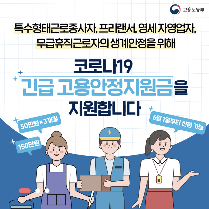 긴급 고용안정지궝은 특고, 프리랜서, 영세 자영업자, 무급 휴직자들을 대상으로 하며, 지난 3월-3월간의 소득이 작년에 비해 감소했다는 것을 증명할 수 있거나, 3-5월에 무급휴직을 했다는 것을 입증할 수 있어야 합니다.